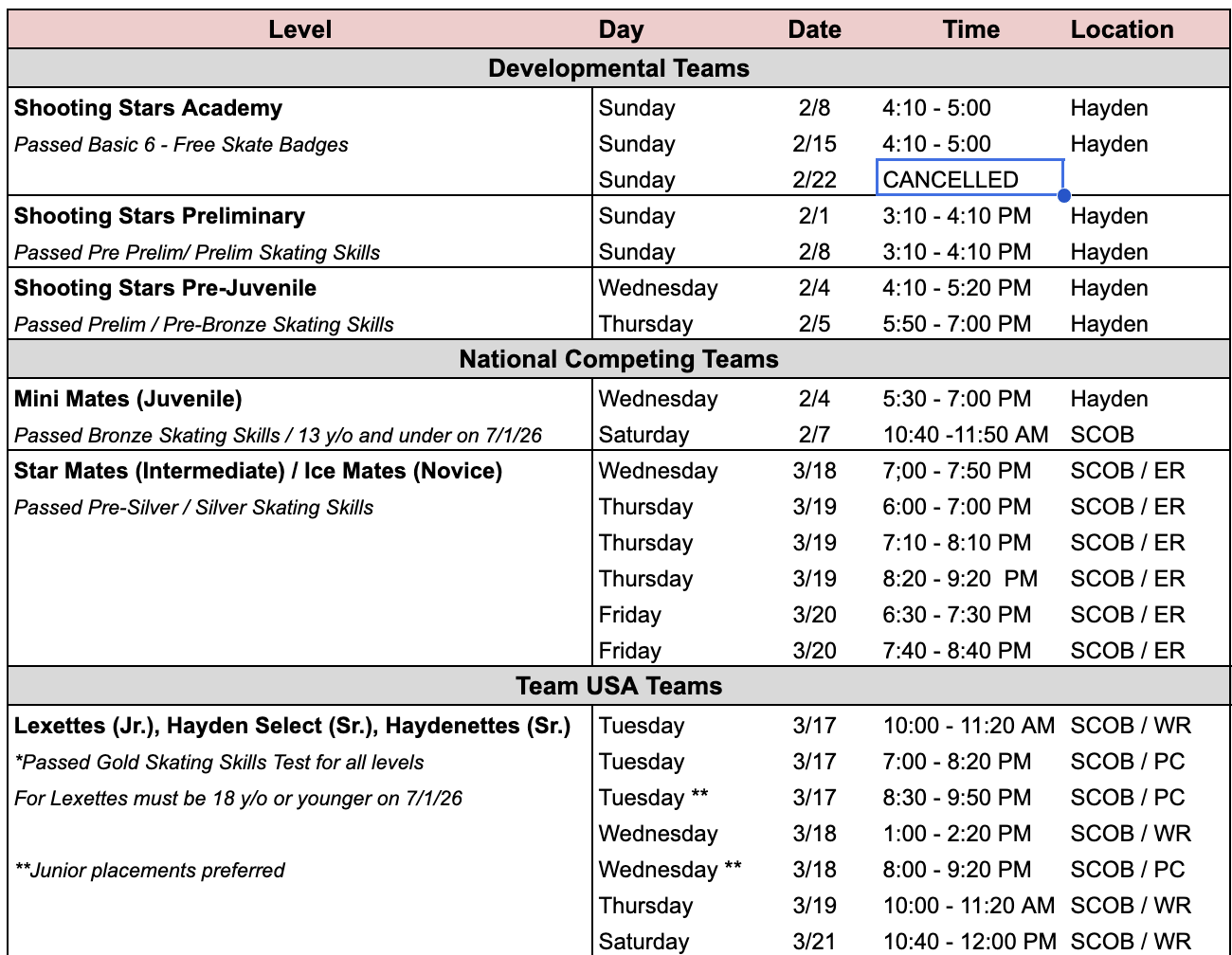 *Current HSST skaters should expect to attend sessions w/ their current team / level regardless if they are trying out for a higher level. For example a skater on Shooting Stars Preliminary Team should expect to attend the Preliminary placement session even if they are trying out for the Pre-Juvenile level.